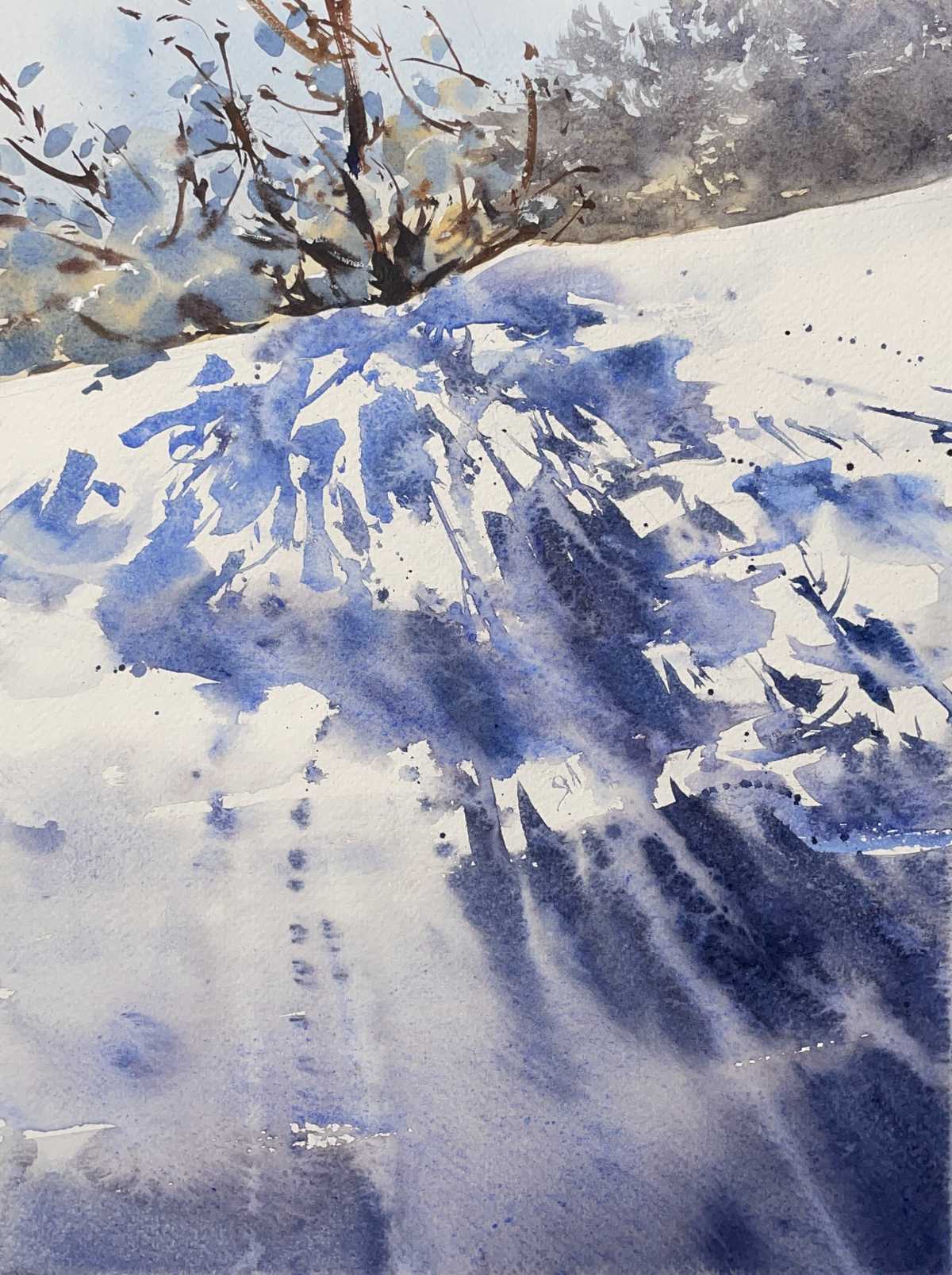 Shadows spill down a fresh snowbank. A very splashy painting that left puddles on the floor.