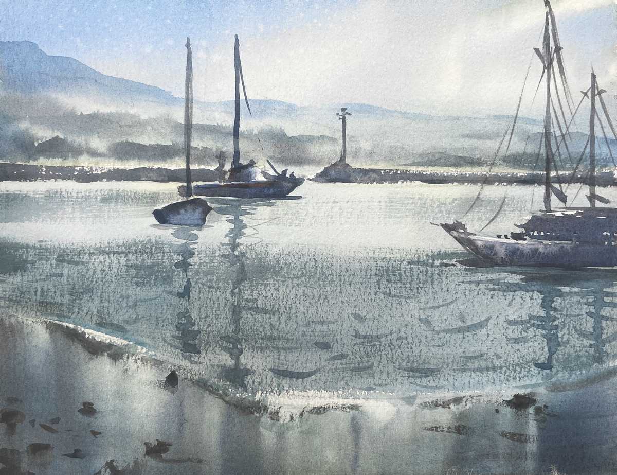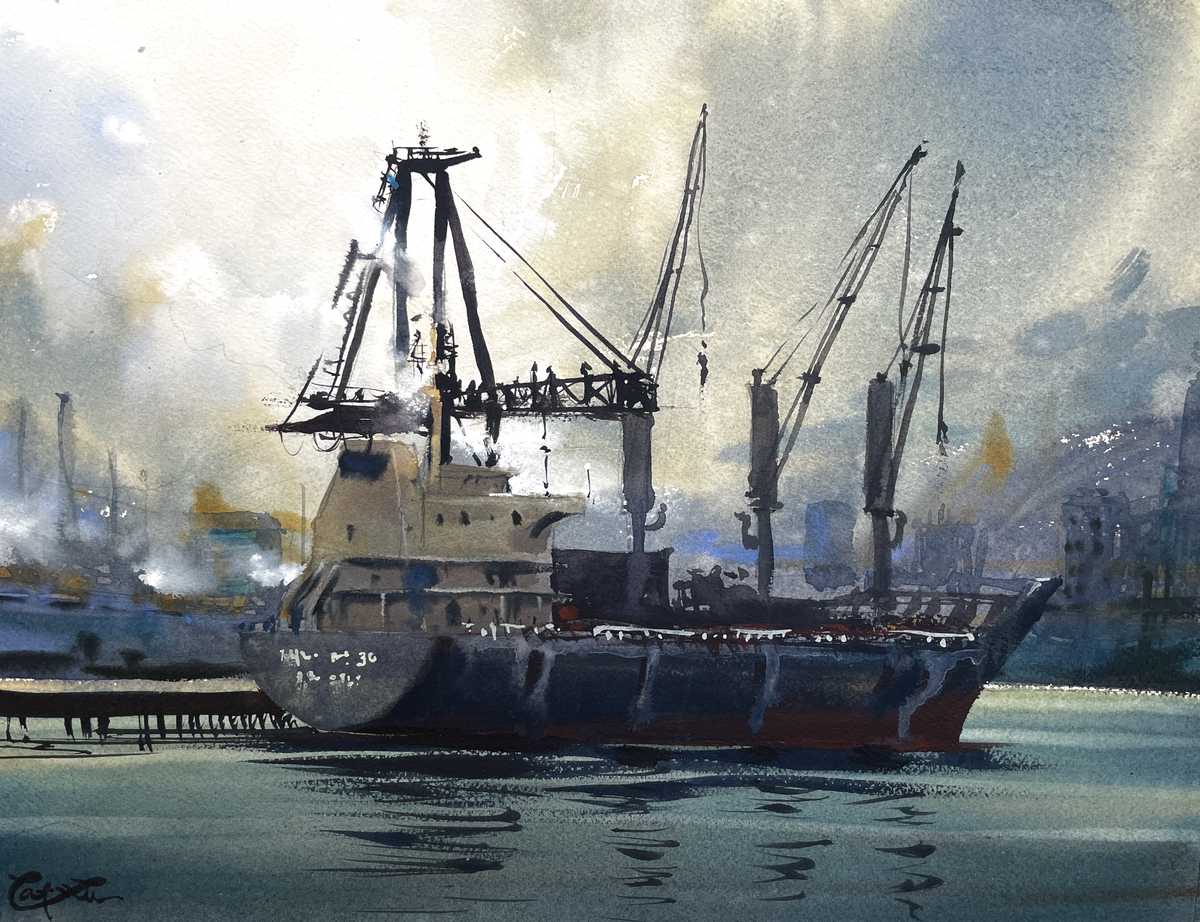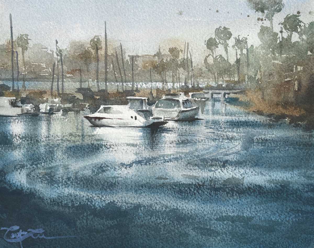 "A particularly light touch and confidence are asked of the watercolorist. Cathy Xu excels in these virtues. Her 'Saluting the Hornet' is a deft symphony of neutral colors side by side describing the intricate ins and outs of the ship's structure." -Karen Braun Malpas in press coverage of the 20th annual Frank Bette Plein Air Paintout
