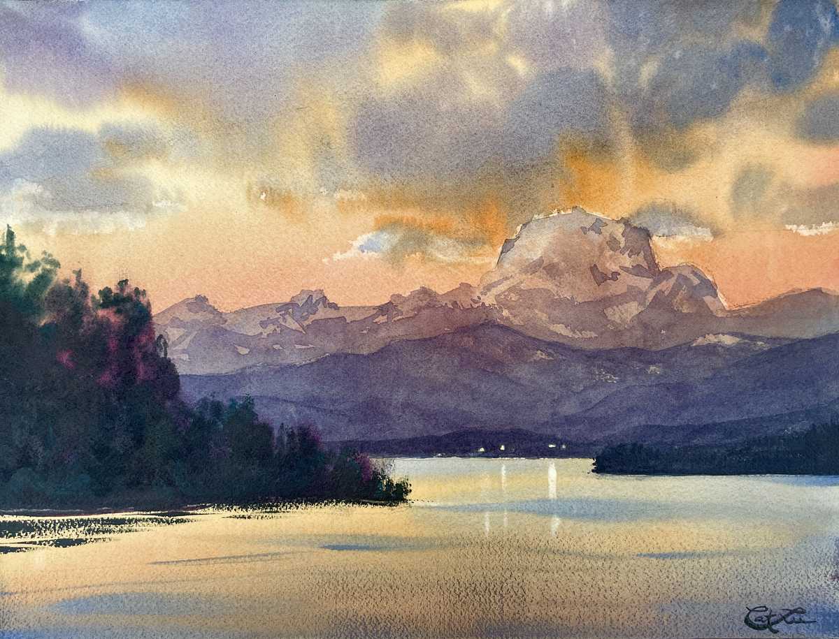 This view of sunset striking Mt Lassen was painted at the Lake Almanor vista point.