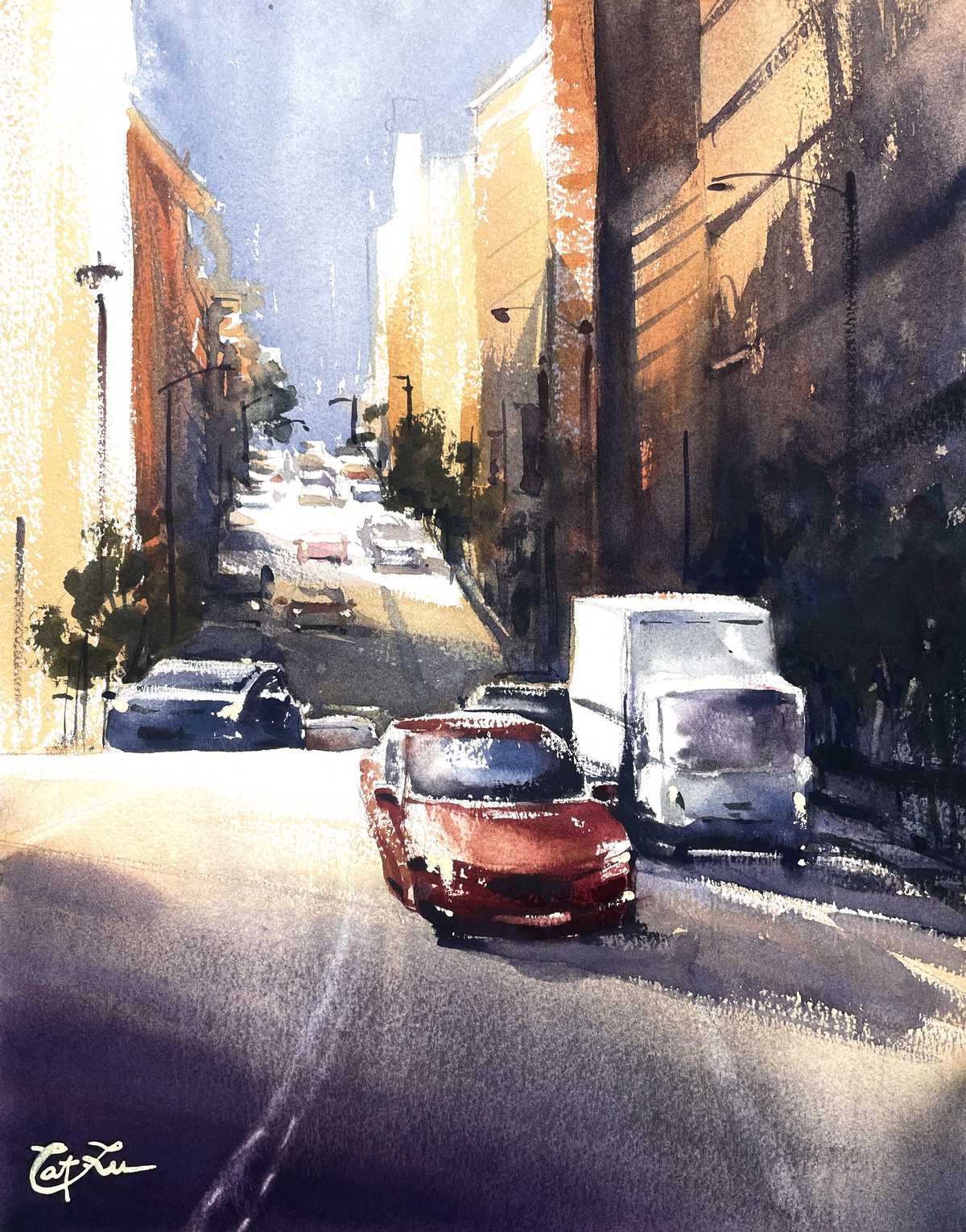 Painted in studio from a plein air piece, exploring the stark pattern of light and shade in the canyon of downtown SF.